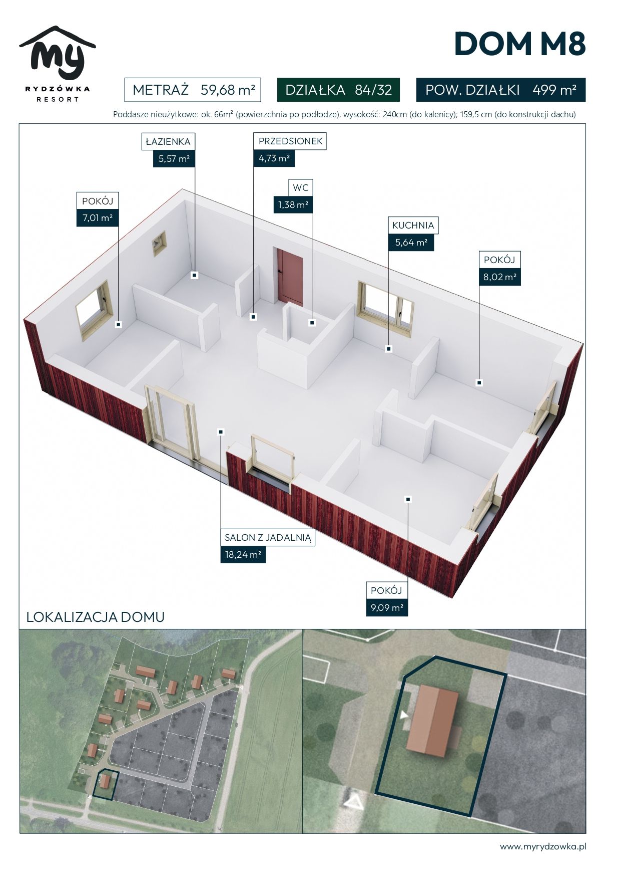 Dom M8 to przytulny budynek o powierzchni 59,82 m², usytuowany na działce liczącej 499 m². To propozycja dla osób, które szukają funkcjonalnego domu z bardziej kompaktowym i łatwiejszym w pielęgnacji ogrodem. Nieruchomość idealnie sprawdzi się zarówno dla par, rodzin, jak i inwestorów planujących wynajem krótkoterminowy w atrakcyjnym regionie.